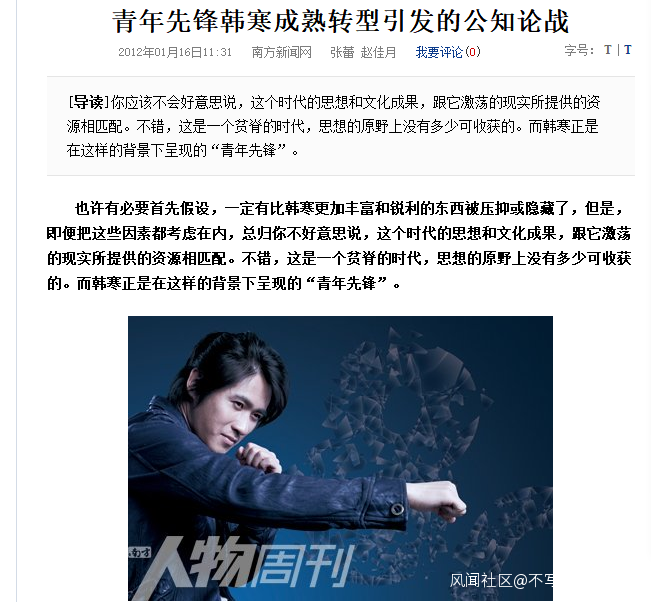 敢説真話、無所畏懼的青年韓寒,得到了南方報業的大力吹捧。隨即《南方人物週刊》刊發了長篇文章,討論韓寒帶來的影響。