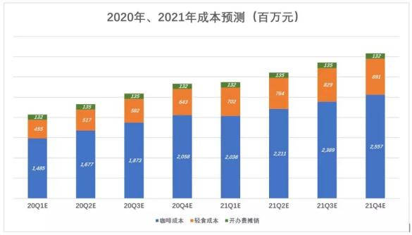 由於規模效益,假設2020年每杯成本降至11元,2021年降到10元。2020年、2021年總成本227億元,毛利潤65.5億元。
