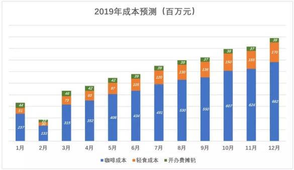 瑞幸咖啡主要成本包括咖啡(包括食材、房租、人工等),輕食成本及門店開辦費攤銷。2019年,三大成本分別為53.6億、13億和4.63億,共計48.06億元,毛利潤近9.3億。