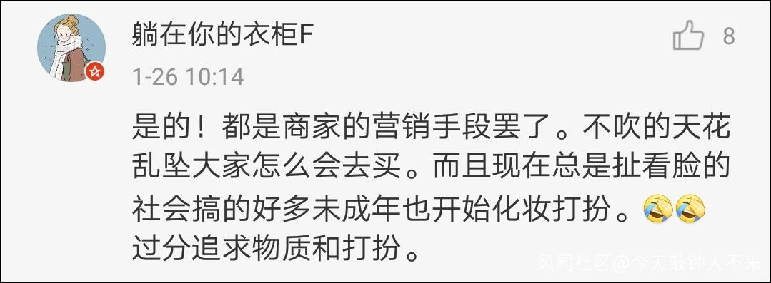 不少人都贊同蕭瀟的話語,認為現今不僅是口紅,擴大到整個彩妝領域、時尚領域,很多時候都是商家的營銷手段在天花亂墜地渲染着一種“你必須得買”的氛圍,而我們的消費者還甘之如飴。這些營銷手段中,有些甚至還鼓吹未成年人也應該追求物質,開始化妝打扮。