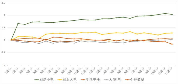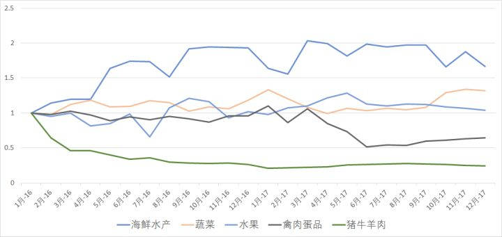 我們使用京東的各品類月度消費數據,計算了所有品類商品從2016年1月到2017年12月的消費升級指數。