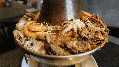 只要加入海味,尋常飯菜也會變得精彩。山海關有名的**“葷鍋子”**,歸根到底不過是東北常見的酸菜白肉鍋。可是一旦把對蝦、牡蠣、墨魚、海蟹層層疊疊放進鍋裏,簡單的火鍋就變成完全不同的味覺體驗。