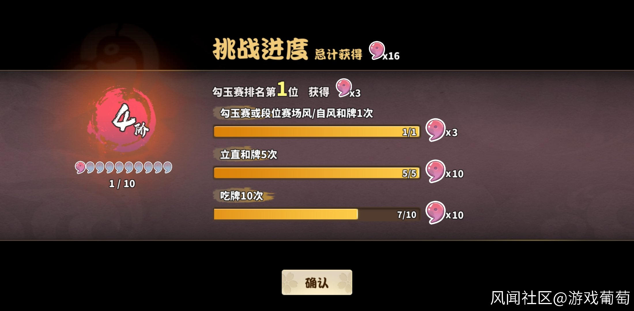 另外,除每日登陸獎勵、成就係統與十連抽保底出角色外,《雀姬》給予休閒玩家較好體驗的地方還在於“勾玉賽”這一模式。該模式專為獲取獎勵而設計,對局長度限定為東風賽,勝負無關段位,且第四位不會有任何懲罰。但只有每一局的1、2名,才能夠獲得勾玉。至於勾玉的作用,當其積累到一定數量後,就可以解鎖對應的獎勵。而每日和每週挑戰可以幫助玩家更快積攢勾玉。