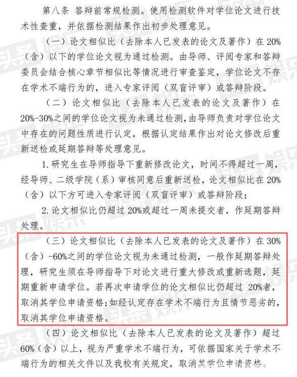 《北京電影學院學位論文學術不端行為處理辦法》第八條規定,論文相似比(去除本人已發表的論文及著作)在 30%(含)-60%之間的學位論文視為未通過檢測,一般作延期答辯處理,研究生須在導師指導下對論文進行重大修改或重新選題,延期重新申請學位。如經認定存在學術不端行為且情節惡劣,可取消其學位申請資格。