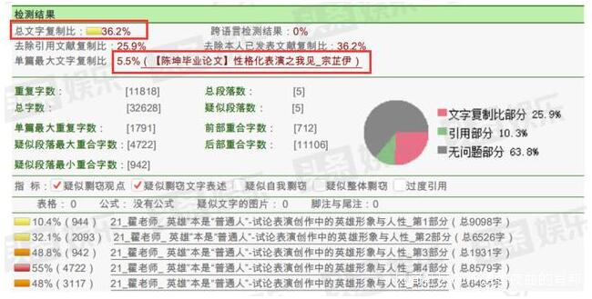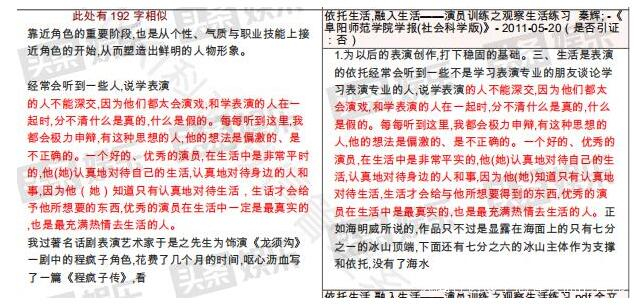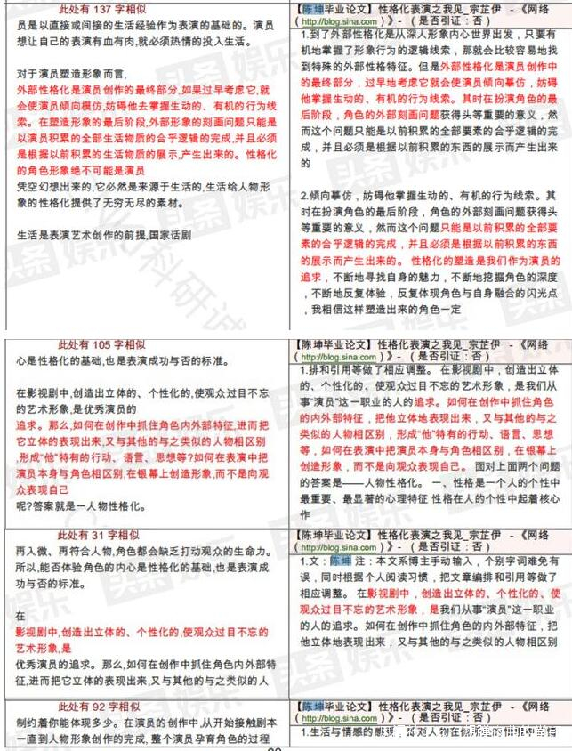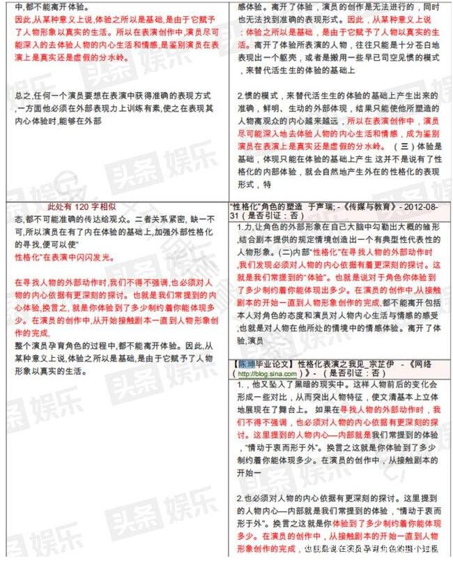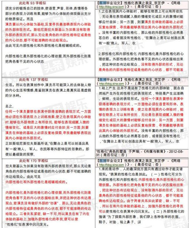 總體來看,翟天臨的碩士畢業論文單篇最大文字複製比5.5%,為陳坤的畢業論文《性格化表演之我見》,單篇最大重複字數為1791字。全文對比顯示,翟天臨和陳坤論文共13處相似,除去5處引用文獻外,另有8處高度重合。