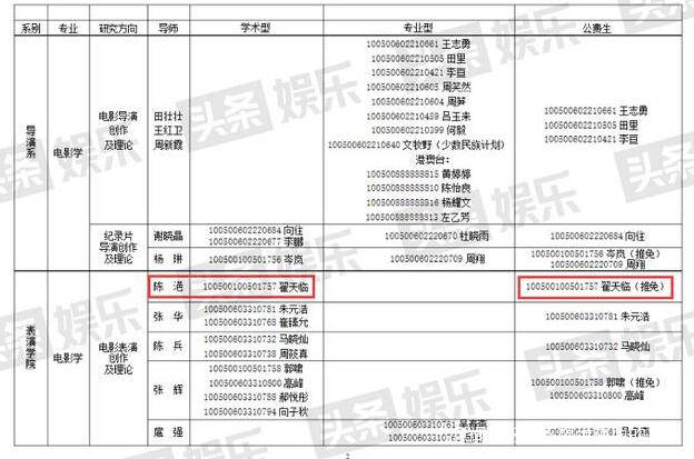 在北京電影學院2010年碩士研究生招生擬錄取名單可以看到,翟天臨由免推入學,當年同批近160名被錄取考生只有10人是推免生。翟天臨的碩士導師陳浥是北京電影學院表演學院前任院長,現任學院總支書記、副院長,其在翟天臨碩博期間只負責翟一個人。