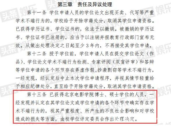 北京電影學院官網顯示,已獲得北京電影學院博士、碩士學位的人員,一經發現並認定在其學位論文或學位申請的各個環節中確實存在學術不端行為的,視其嚴重程度、所產生的不良社會影響和對學校造成的損失等方面,由校學位評定委員會作出處理決定。