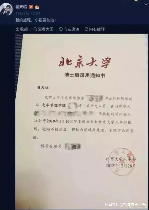 翟天臨在微博上曬北大光華管理學院博士後證書