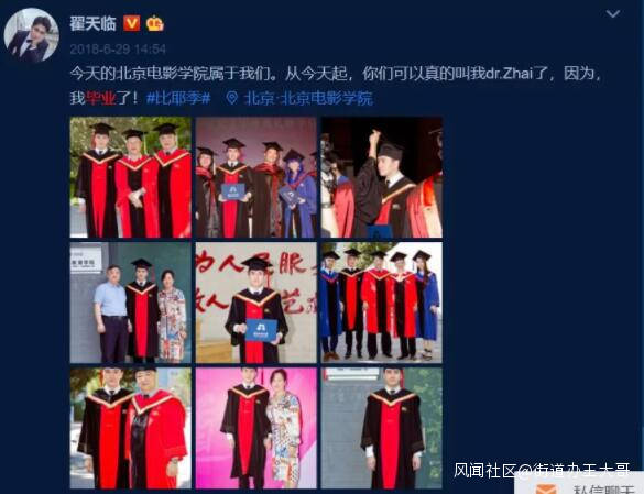 2018年6月29日,翟天臨在微博曬出畢業照。