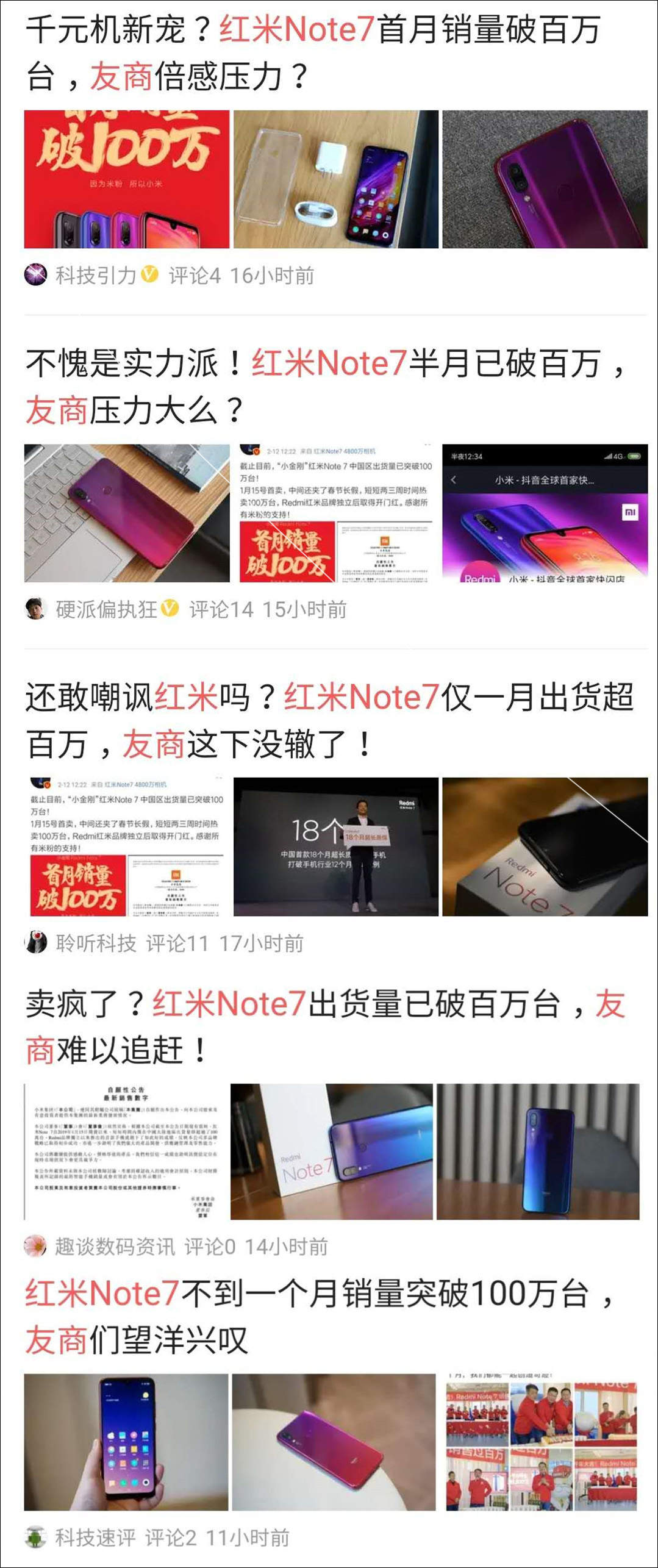 我用“紅米Note7”與“友商”作為關鍵詞,可以搜出上圖所示的這些結果。可以看到,這些科技類自媒體的文章畫風幾乎都是一個風格,就是紅米成功吊打了友商。