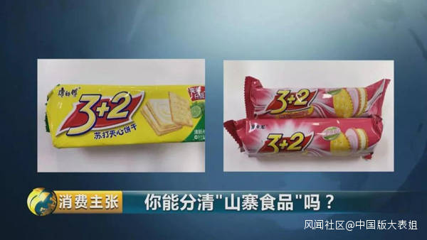 “3+2”餅乾看看這兩款都打着“3+2”字樣的餅乾,你能猜出哪一款是知名企業生產的,哪一款又是小廠生產的呢?