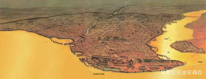 後來中亞的塞爾柱突厥崛起,後來契丹崛起,隨後蒙古崛起,內亞的民族一次次的打到歐洲,都沒讓這個苟延殘喘的四戰之地國家滅亡,很大一個原因就是固若金湯的拜占庭,這地方自從當年皈依基督教的羅馬皇帝君士坦丁大帝遷都之後,就開始大力營建,獨特的地理位置加上城牆,形成了一個不破之城——我們先看下現在已經叫了伊斯坦布爾的拜占庭的位置——
