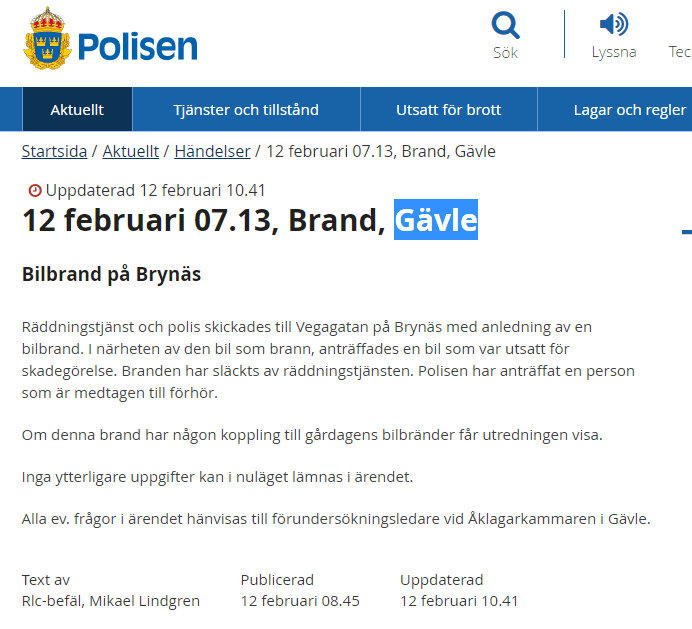 早上7點十分左右,Brynäs區的Vegagatan一輛沃爾沃突然燒了起來,警方接到報警後,觸動救援車很快把火滅了,沒想到,這僅僅是一個小的開頭……