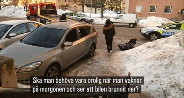 813日和14日兩天,瑞典全境多個城市上百輛汽車遭焚燬。一名市民在第二大城市哥德堡拍攝的視頻顯示,身穿黑色套頭衫的青年用棒球棍砸車窗,並向汽車頂澆汽油,最後投擲燃燒瓶將其點燃。在小城特羅爾海坦市,數十名青年不僅聚眾燒車,還用石塊襲擊前來維持秩序的警察。