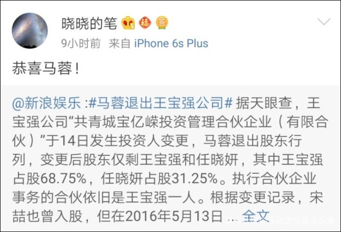 據天眼查信息,2月14日,王寶強公司“共青城寶億嶸投資管理合夥企業(有限合夥)”發生投資人變更,馬蓉退出股東行列,變更後股東僅剩王寶強和任曉妍,其中王寶強佔股68.75%,任曉妍佔股31.25%。執行合夥企業事務的合夥依舊是王寶強一人。根據變更記錄,宋喆也曾入股,但在2016年5月13日退出投資,當時由馬蓉新增成投資人。