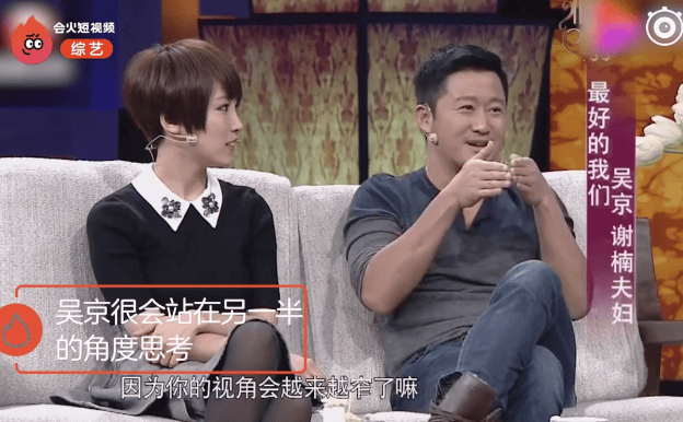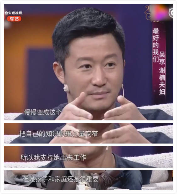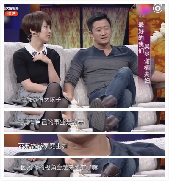 吳京這時候站出來為謝楠説話,他説,不鼓勵老婆當家庭主婦,她有自己的事業是好事。