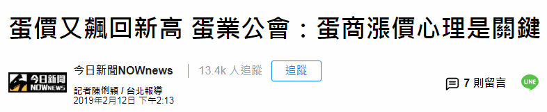 對目前的“缺蛋”情況,台灣“中時電子報”則對形容稱,“雞蛋缺口難填”,並援引蛋商表示,因過年雞農淘汰掉一批年前拼命生的老母雞,產量還無法跟上,所以會反應在市場供需價格調漲。