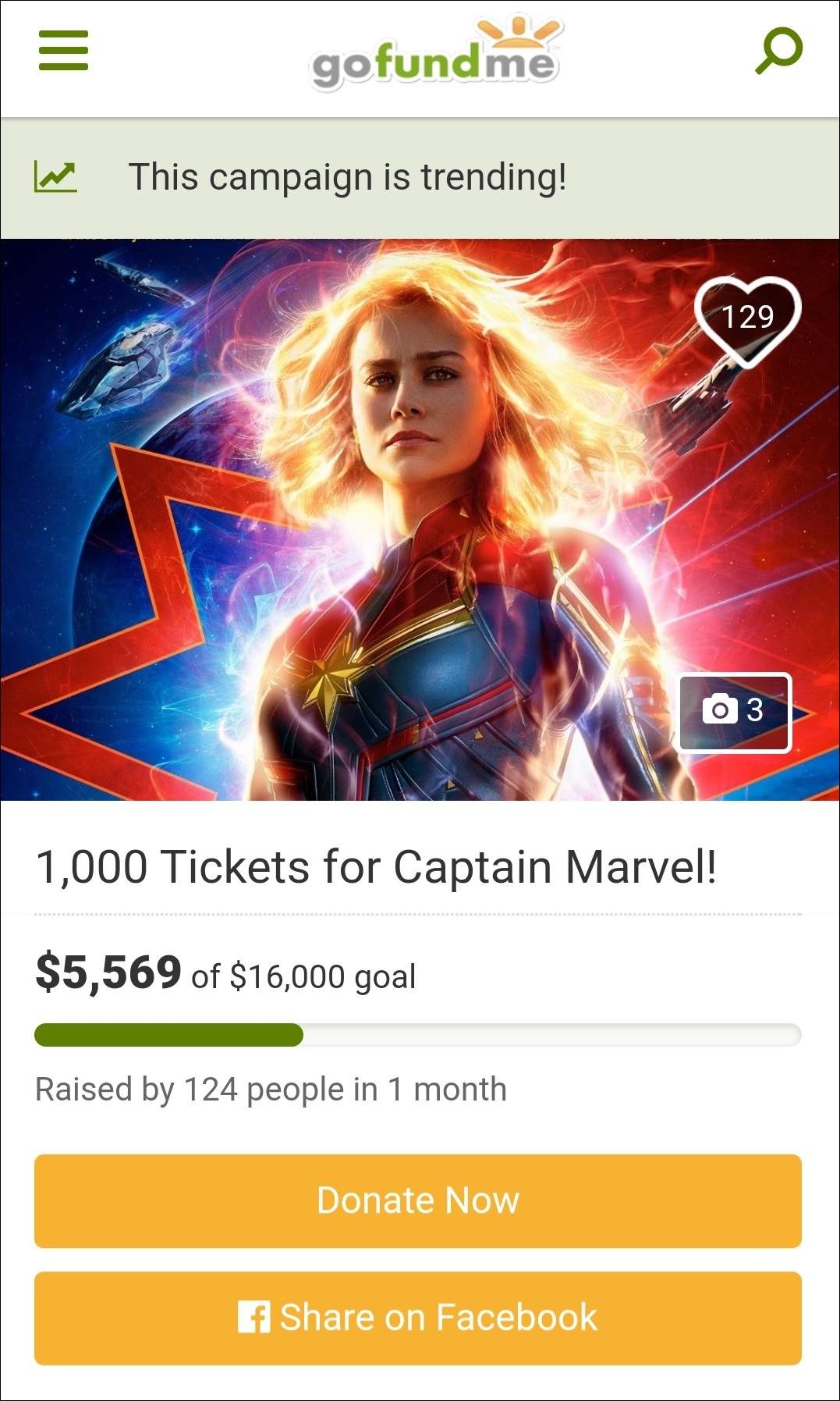 據瞭解,此次眾籌活動希望能夠募集到1萬6000美元的金額,這些錢款可換得1000張《驚奇隊長》的電影票。換而言之,就是能夠幫助到1000個貧困女孩去看到《驚奇隊長》這部電影。截止今天下午,已經有124人進行捐款,募集到資金5569美元。