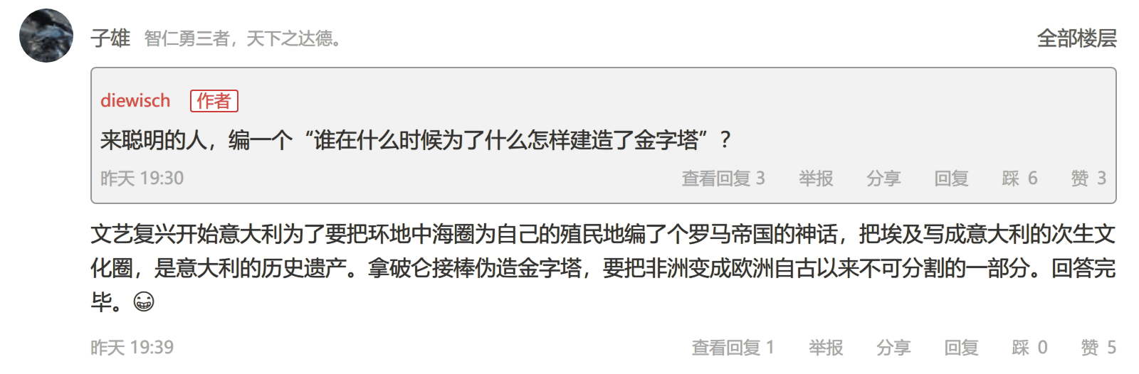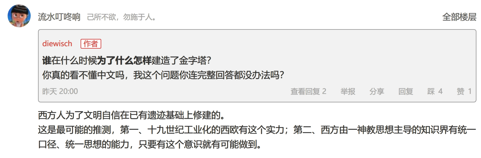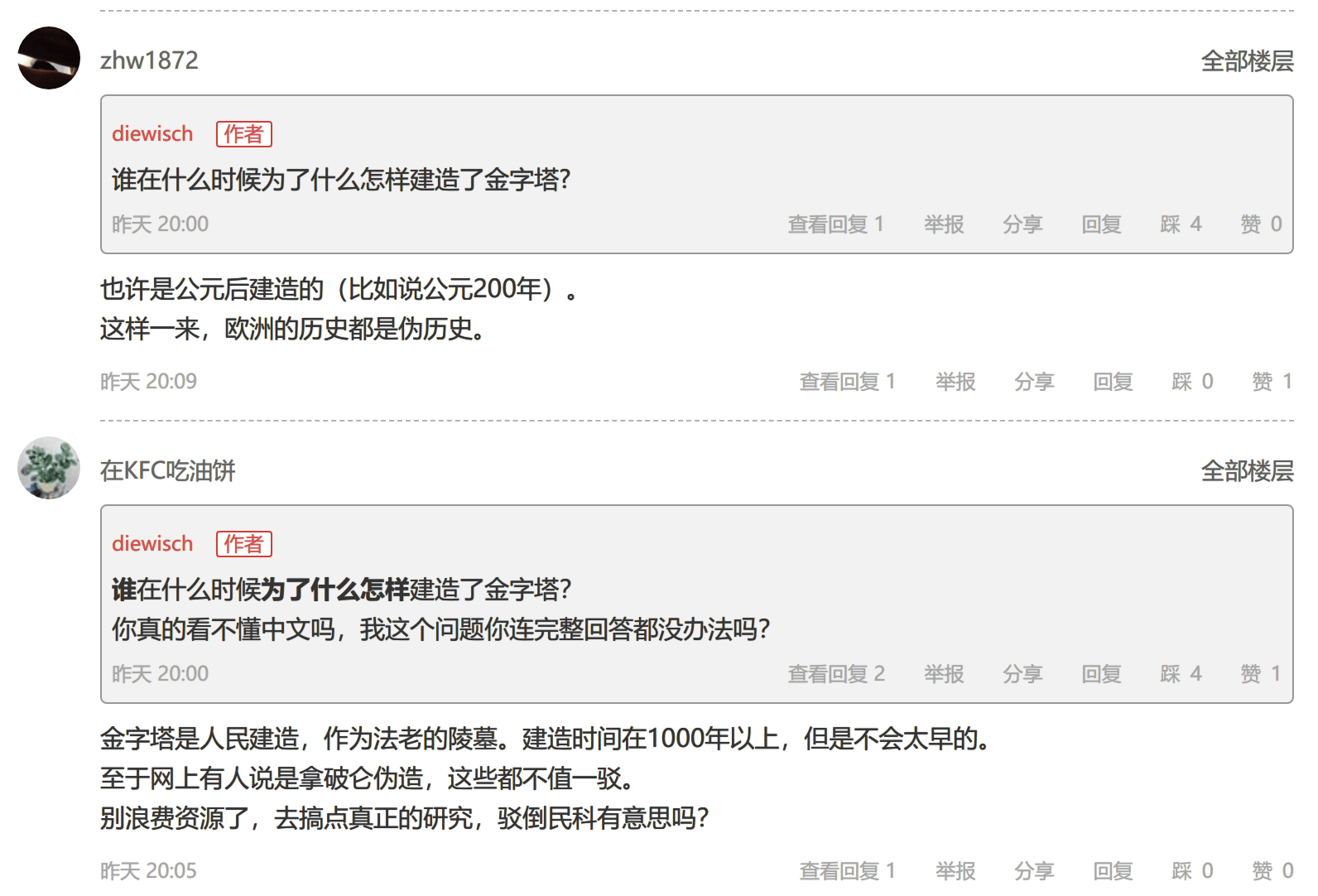 昨天我發帖的《金字塔造假的技術推斷?》,在最後提了一個頭腦風暴問題“誰在什麼時候為了什麼怎麼建造的金字塔?”主貼算是拋磚引玉,既然風聞社區裏很多人都相信金字塔是後世偽造的,那麼動動腦子,把怎麼偽造的過程補充完整不是很好嗎?但是結果卻是讓人大失所望,沒有一個人能把這個問題,按照句子結構,完整地回答出來。