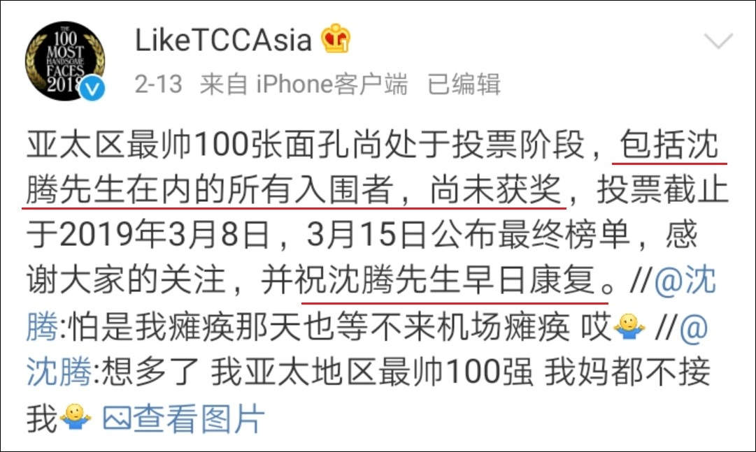 組織“亞太區最帥100張面孔”評選活動的官微也轉發了沈騰的微博,還直接“打臉”説:“亞太區最帥100張面孔尚處於投票階段,包括沈騰先生在內的所有入圍者,尚未獲獎,投票截止於2019年3月8日,3月15日公佈最終榜單,感謝大家的關注。”