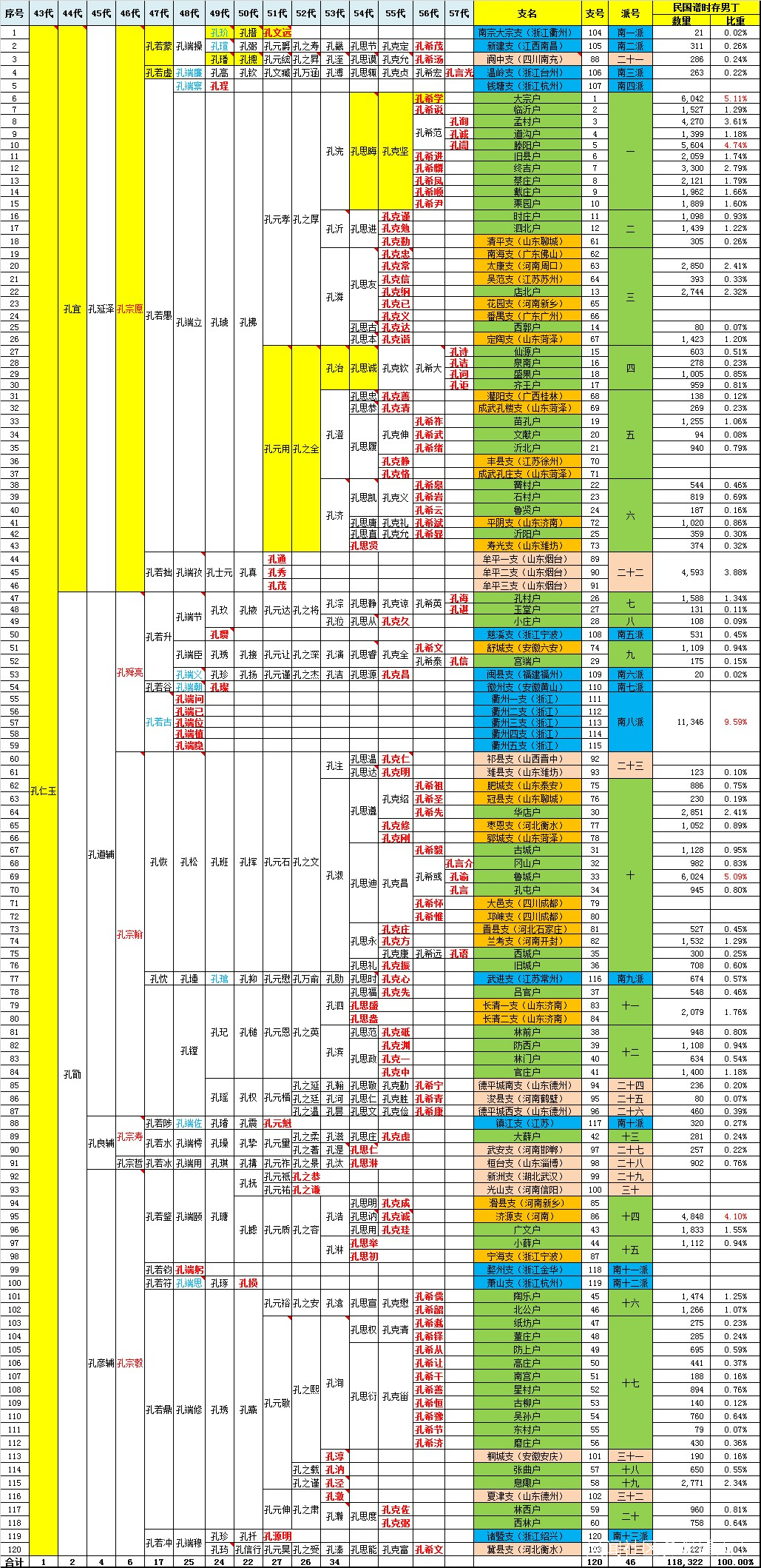 中興祖後裔傳世至今共120支,其中留曲阜60支(即60户),流寓外地60支,見下表:
