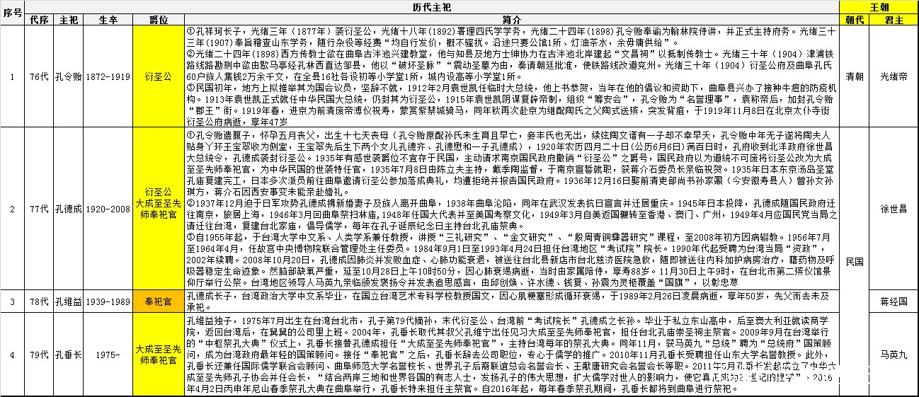民國衍聖公事蹟,詳見下表: