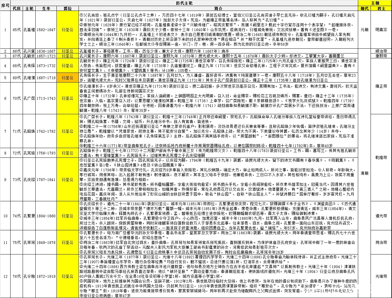 清朝衍聖公自孔興燮共傳十一世,衍聖公事蹟見下表: