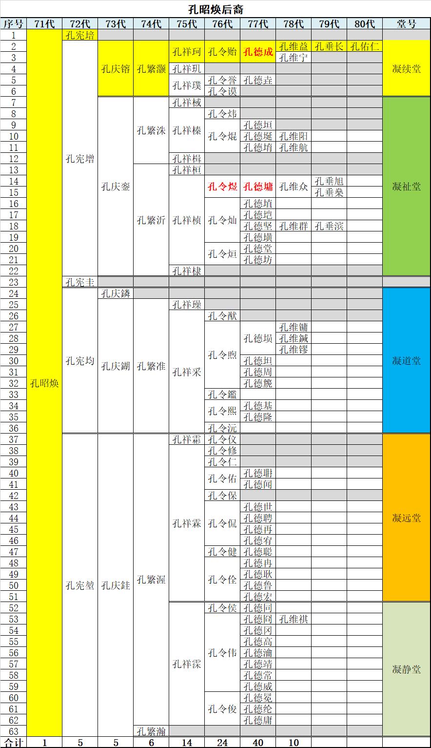 注:衍聖公孔昭煥有五子,後裔分五堂:長子憲培無後過繼慶鎔(憲增長子),為凝續堂;次子憲增,為凝祉堂;三子憲圭無後過繼慶鏻,慶鏻又無後過繼繁渥,為凝遠堂;四子憲均,為凝道堂;五子憲堃,有一子(慶銈)二孫(繁渥繁瀚)三曾孫(祥霦、祥霖、祥霂),繁渥出嗣,繁瀚無後過繼祥霂(繁渥三子),為凝靜堂。