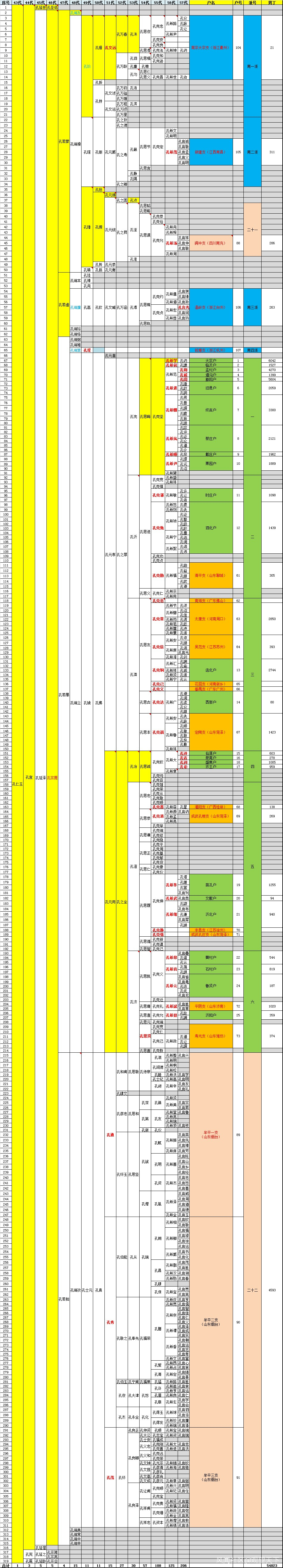 明朝衍聖公自孔希學(56代)共傳十世,至65代胤字輩共202人,家譜如下: