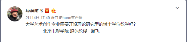 所以,前兩天,北電退休老師,也曾是著名導演的謝飛在微博上發聲,談大學藝術創作專業需要開始理論研究型的博士學位教學嗎?