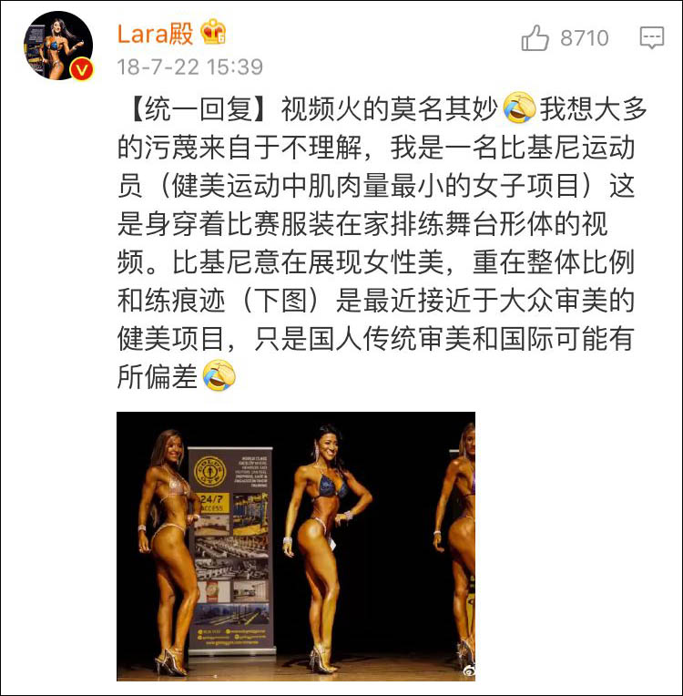 博主@Lara殿 馬上進行了回應,表示自己是正規的健美運動員,與所謂“淫穢色情”毫無關係,