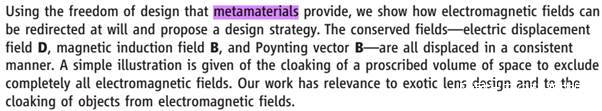 這樣奇妙的設計思路,由2006年發表在《Science》上的一篇文章:Controlling Electromagnetic Fields率先提出,通訊作者是來自英國帝國理工的J. B. Pendry,那麼是什麼契機讓他們提出這樣一套設計思路呢?文章裏給出了答案——Metamaterials,超材料。
