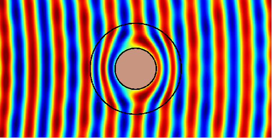 科研人員也正是利用這套思路,設計了上圖由玻璃(折射率為1.78,圖中白色區域)以及空氣(折射率為1,圖中深藍色區域)組合而成的柱狀“隱身斗篷”,它只適用於在水(折射率為1.33,圖中淡藍色區域,有外部區域和內部通孔兩部分)中物體的隱身。通過設計合適的玻璃以及空氣部分的尺寸就可以達到隱身的目的。