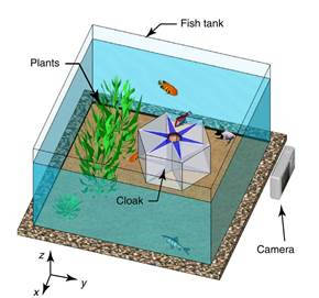 實現隱身的思路概括起來其實也不復雜,水中的魚進入通孔前之所以不能隱身,那是因為當四面八方傳播而來的光線到達金魚身上時,或被反射、散射或被遮擋,我們通過這些被反射、散射或被遮擋的光線可以感知到魚兒的存在,但如果我們能夠使光線繞過小金魚傳播,儘量減少小金魚對外界光線影響,就可以實現對小金魚的隱身。