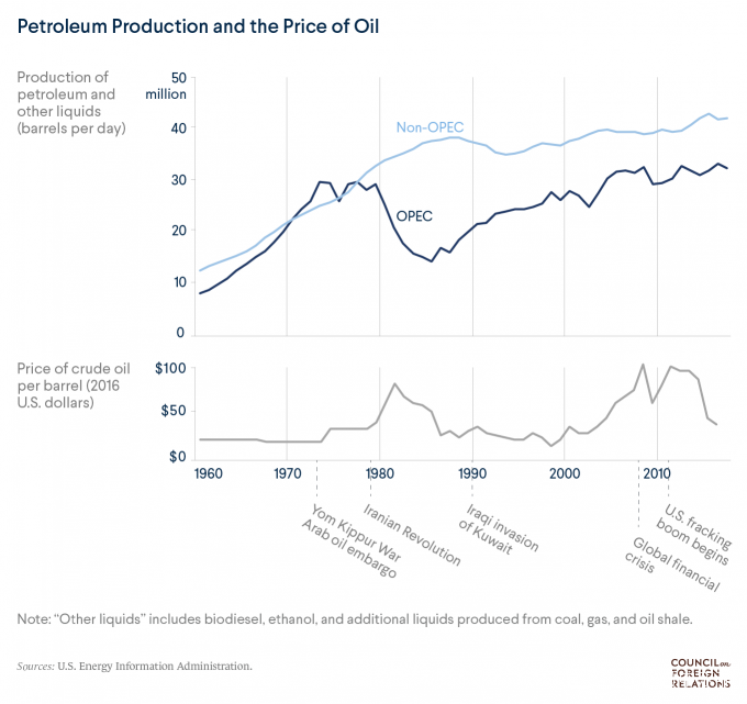 石油輸出國組織由伊朗、伊拉克、科威特、沙特阿拉伯和委內瑞拉於1960年建立;多年來,它的成員不斷擴大和縮小。最初的五國試圖建立統一戰線,以應對控制着西方國家大部分石油進口的跨國石油公司實施的油價削減,以及美國政府在上世紀50年代對外國石油進口設置的限制,這些限制壓低了外國石油的價格。石油輸出國組織(OPEC,簡稱歐佩克)的創始成員國不僅開始談判提高全球公佈的油價,還通過將國際石油公司(international oil company)的特許權國有化,尋求對本國資源的更大控制權。大多數歐佩克國家現在擁有所有的石油儲備。