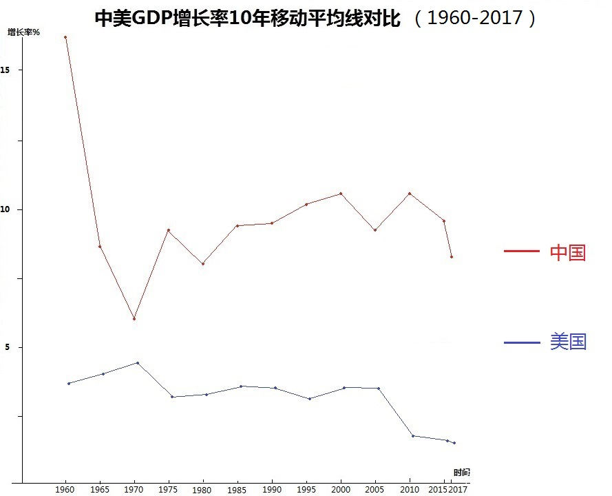 上面的兩張圖幾乎説明了一切問題,但前提是必須做正確的解讀。如圖所示,這是兩張對比圖,反映的是中美兩國自1959年以來,經濟增長率10年移動平均線的對比。