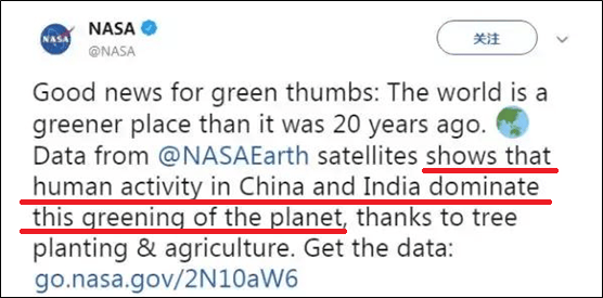 前幾天(12日),美國航天局(NASA)興奮地發了一條推特,翻譯過來大概就是好消息!好消息!地球比以前更綠了!原來的黃土地、黑土地、紅土地,統統變綠了!感謝中國和印度,為地球變綠做出了巨大貢獻!