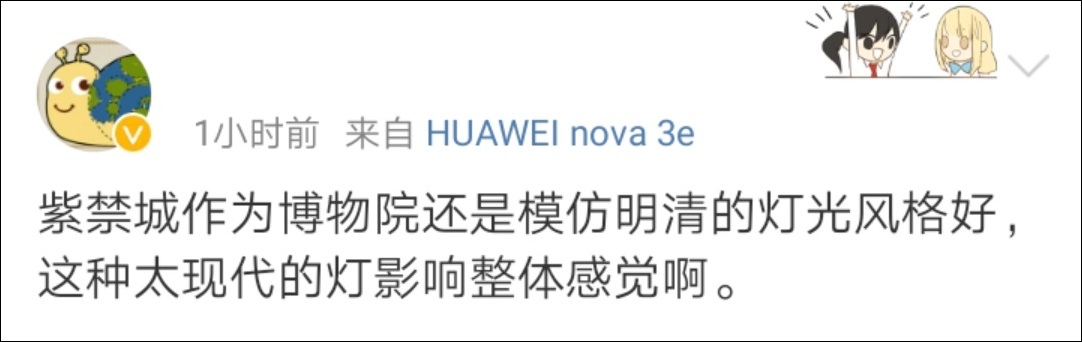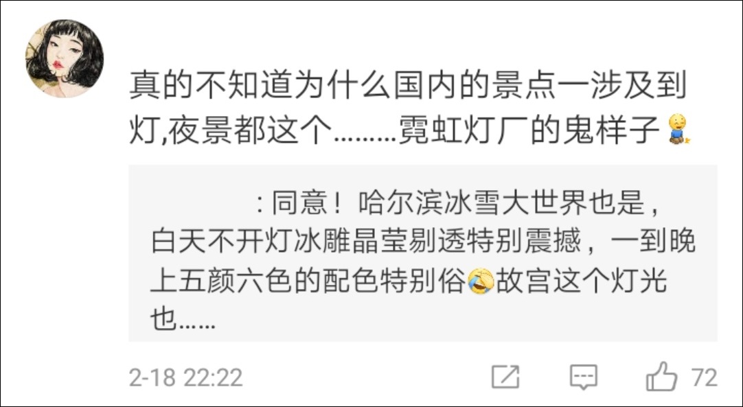 知名大V@戰爭史研究WHS 和@paingod 都發文表示,民眾之所以選擇夜遊故宮,不僅僅是因為這一次故宮夜間開放的機會難得,同時也是希望能夠滿足自己的獵奇心理,但是佈置了這樣的燈光之後,搞得跟冰燈節之類的活動就沒有什麼區別了。