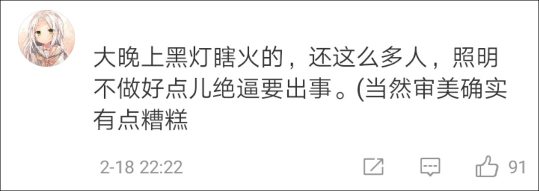 不過也有網友認為,如果一昧地追求原汁原味的話,可能照明的亮度就不夠,大晚上的要是磕着碰着那就麻煩了。