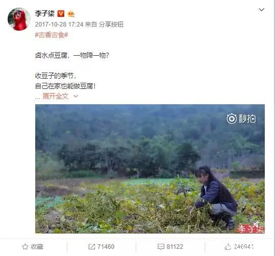 古韻十足美人加上垂涎欲滴的美食讓李子柒成為網紅界一匹黑馬,吸粉無數,短短兩年,微博並擁有1400多萬粉絲。