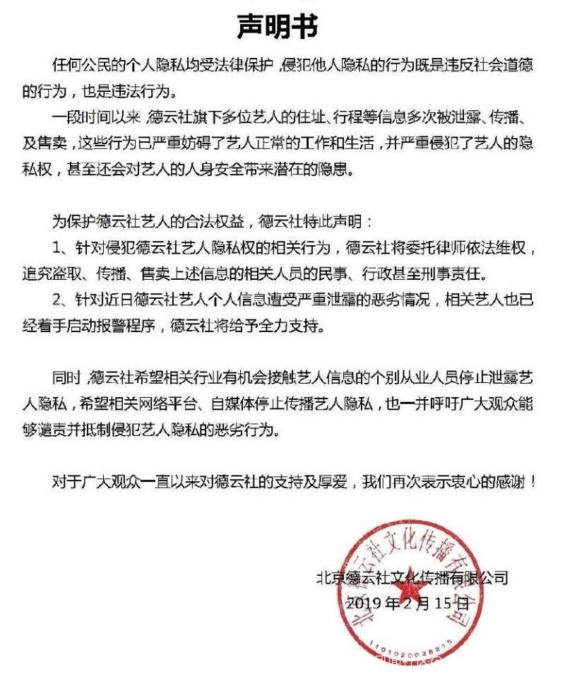 2月15日,德雲社在其官方微博發佈聲明書:一段時間以來,德雲社旗下多位藝人的住址、行程等信息多次被泄露、傳播及售賣,這些行為已嚴重妨礙了藝人正常的工作和生活,並嚴重侵犯了藝人的隱私權,甚至還會對藝人的人身安全帶來潛在的隱患。