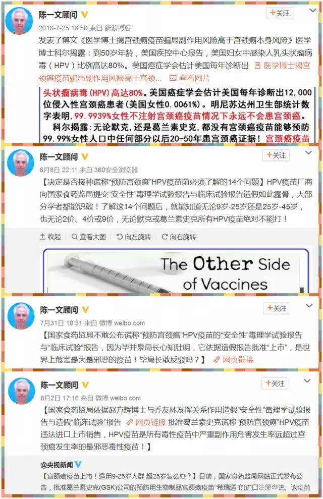 春節前,有一個叫陳一文顧問的微博賬號發佈了聳人聽聞的宮頸癌疫苗致死消息,並將其説成是疫苗公司故意掩蓋真相,美國法庭正在對公司展開調查。這種醜聞+陰謀,成功地迎合了人性的弱點,很多網友引起了一大波人的恐慌。