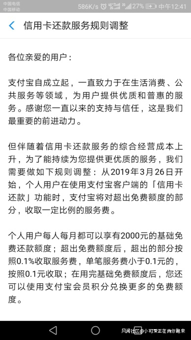 7個月後,支付寶也跟進公告稱,因綜合經營成本上升,將對個人用户超出免費額度(2 萬元)的提現收取 0.1% 的服務費,永久免費額度 2 萬。更多免費額度可用支付寶積分兑換。
