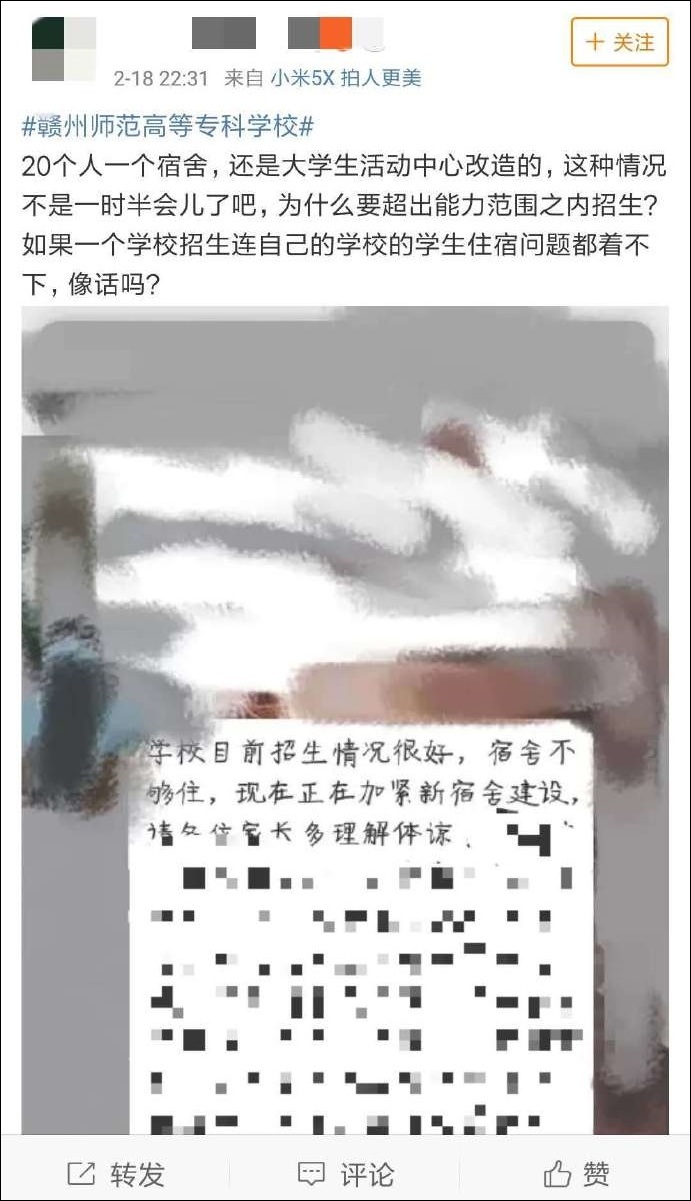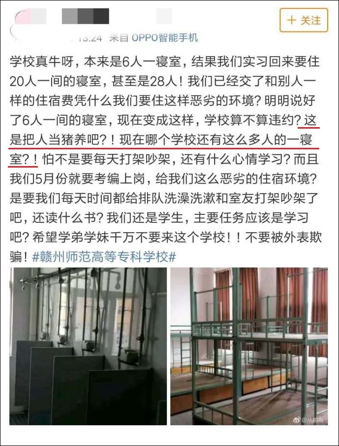 爆料網友自稱是自己來自於贛州師範高等專科學校。他指稱,相關寢室是由大學生活動中心改造而來的,使用的是公共浴室,陰冷潮濕,衣服晾曬都成為問題……住宿環境極其惡劣,甚至不得不兩到三個人合用一張桌子。網友吐槽,這樣的居住條件到底是養人,還是養豬呢!
