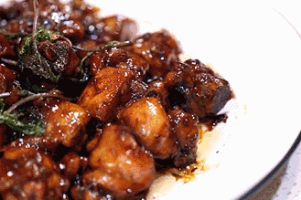 同樣是炒,贛南小炒魚又是另一番滋味。草魚改刀成塊,掛粉過油,重點在於爆香葱、姜、辣椒,也投入魚塊翻炒,點睛之筆則是最後加入醋和芡汁。辣椒個性強,卻絲毫沒有奪取魚的風頭,反而讓鮮味在辣的催逼之下更加活躍,最後那一抹醋酸,居中調停,辣與鮮不再各自為戰,而是一起漫過整個口腔。