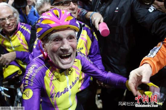 資料圖:105歲法國老人蔘加室內自行車賽。