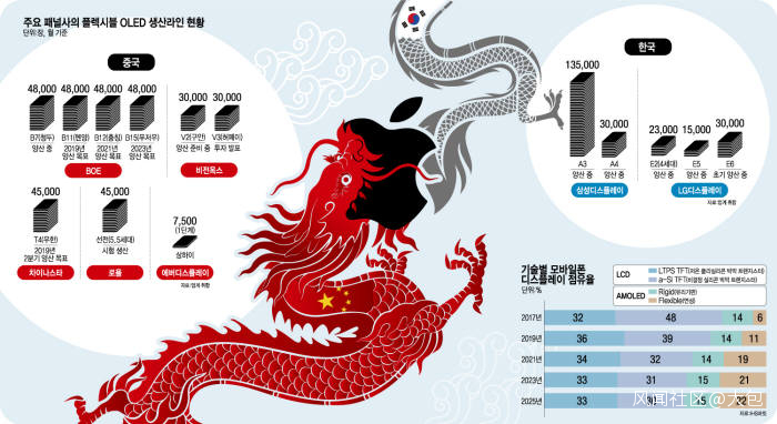 京東方的起步,對於飽受韓企高價制約之苦的手機廠商,可謂眾望所歸。京東方和國內手機品牌關係越來越密切,華為、小米、OPPO、Vivo、中興等十餘家客户都拿下了京東方量產交付的柔性屏,就連蘋果也已經將京東方列為三星和LG之後第三家柔性OLED屏供應商。韓國媒體ET News用了這張圖片表示中國從韓國手中搶走“蘋果”。