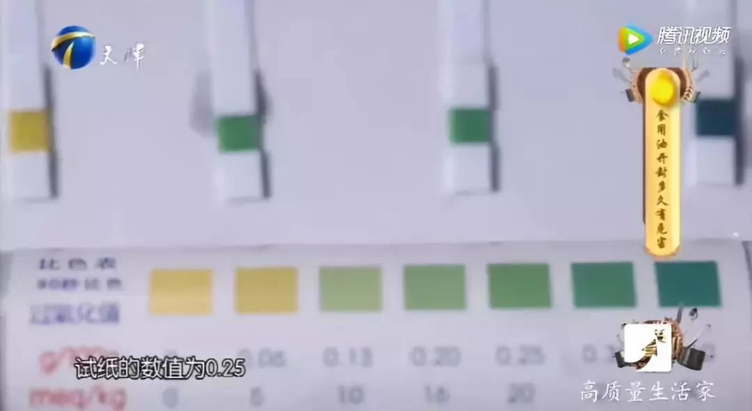 “試紙上顏色越深,意味着其過氧化值就越高;而過氧化值越高,食用油變壞的速度也就越快。過氧化值如果在0.25及以上,就説明它的過氧化度已經很高了。”