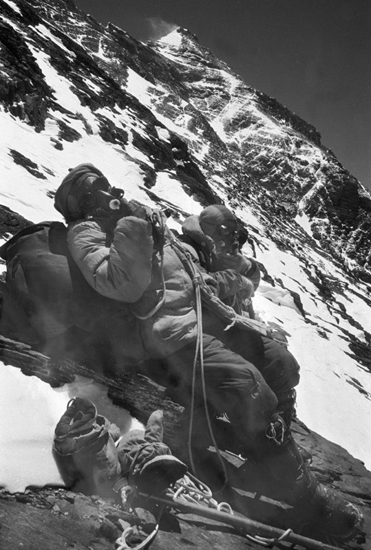 人們已經異常疲憊,幾乎寸步難行。但是,距離頂峯還剩5米時,忽然又遇到一個峭壁,二十七歲的藏族隊員貢布首先攀登上去,他在上面休息了約半個小時,鼓起力氣又幫助其他兩個戰友上去。這樣,世界最高峯的頂峯已經近在他們咫尺了。