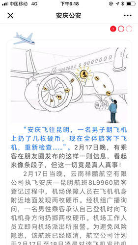 據安徽省安慶市公安局消息,2月17日晚,雲南祥鵬航空有限公司執飛安慶—昆明航班8L9960旅客登記過程中,機場保障人員在飛機機身附近地面發現兩枚硬幣。經機組廣播詢問,一名男性乘客承認自己登機時向飛機機身方向扔擲兩枚硬幣。機場工作人員立即向機場派出所報警。為避免風險隱患,該航班已經取消,航空公司計劃於2月17日至18日凌晨對該飛機發動機進行進一步孔探檢查。事發後,涉事男子接受公安機關調查。